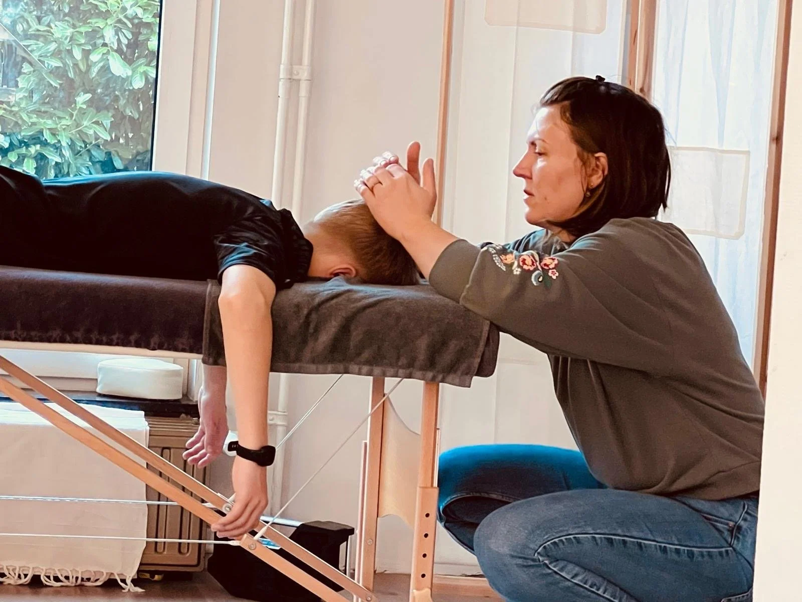 Raisa en Mieke hebben hun behandeltafel naast elkaar geplaatst waardoor je samen met je kindje een zachte energetische healing krijgt. Je kan dit zien als een massage maar dan van jouw energie.